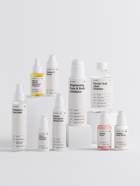 This collection features private label products for deep hydration, brightening and evening out skin tone, helping to prevent and diminish dark spots, balancing skin's microbiome, as well as preventing and lessening the appearance of ageing.